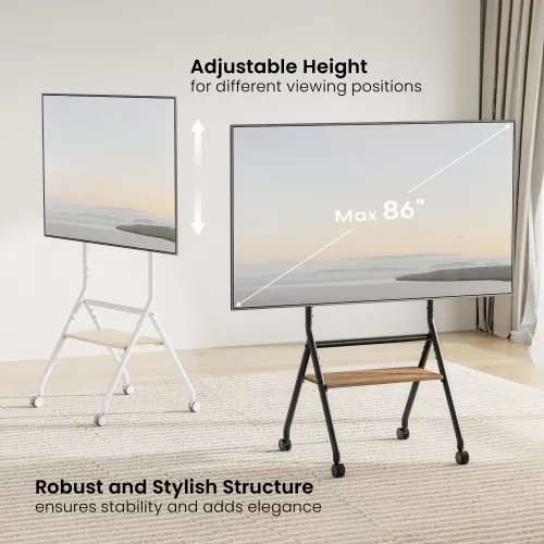Experience a perfect balance of functionality and aesthetics with our TTF13E-46FW Heavy-Duty Studio TV Cart! Its robust structure confidently supports most 37"-86" TVs weighing up to 80kg/176lbs. The adjustable height and easy installation make it versatile, while the convenient storage shelf adds practicality. Durable casters ensure mobility and stability, keeping the work environment active and collaborative.
